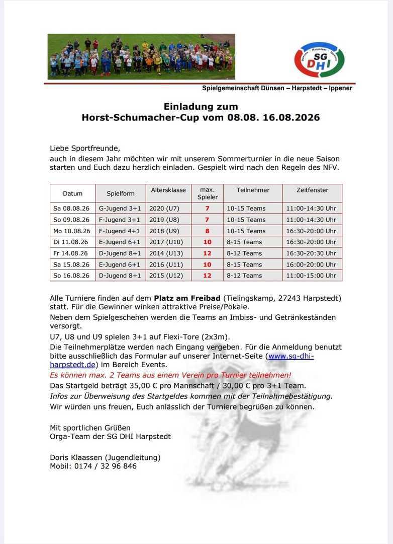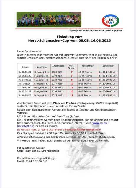 Auch im 2026 möchten wir mit unserem beliebten Sommerturnier U6 bis U13 in die neue Saison starten und Euch herzlich dazu einladen. Veranstaltungsort: Platz am Freibad, 27243 Harpstedt, Tielingskamp!!